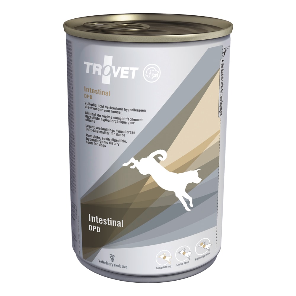Die empfohlenen Anwendungsdauer für Intestinal liegt bei 1-2 Wochen bei Magen-Darm-Problemen und bei anfänglich bei 3-8 Wochen im Fall von Futtermittelunverträglichekiten. Bei Nachlassen der Intoleranzerscheinungen kann Intestinal lebenslang gefüttert werden.Produktbewertungen für Trovet Intestinal Ente-Kartoffel (DPD) Nassfutter für Hunde