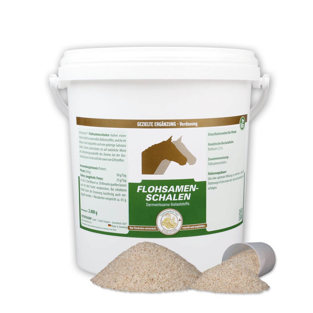 Im Humanbereich wurden die Schleimstoffe und die hohe Wasserbindungskapazität der Schale des Flohsamens schon vor der Antike geschätzt. Mittlerweile finden sie auch erfolgreich bei Pferden mit Verdauungsproblemen Anwendung. Hier reichen einige wenige Gramm der überwiegend aus Indien stammenden Pflanze (Psyllium), die bis zu dem 40-fachen ihrer eigenen Menge an Flüssigkeit aufnehmen und dabei stark aufquellen kann. Während der Darmpassage regt dieser Nahrungsbrei die Verdauung an, die Schleimstoffe pflegen die Magen- und Darmwand und nehmen feste Sedimente, wie Sand und Erde, auf. Flohsamenschalen sollten in regelmäßigen Abständen kurweise an Pferde verfüttert werden. Da die Schalen stark aufquellen, sollten diese immer in Verbindung mit viel Wasser verabreicht bzw. bestenfalls vorab einweicht werden.