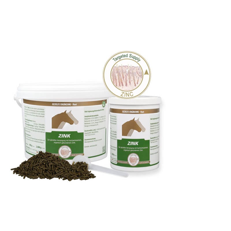 Zink ist eines der am meist gefütterten Spurenelemente beim Pferd. Grund hierfür ist der im Grundfutter immer niedriger werdende Gehalt des essentiellen Spurenelements. Nachdem Zink an einer Vielzahl enzymatischer Stoffwechselvorgänge beteiligt ist, bleiben beim Mangel gesundheitliche Störungen nicht aus. Durch die immer beliebter gewordenen regelmäßigen Blutbilder werden Mangelzustände deutlich früher erkannt als noch vor Jahren, wo regelmäßige Diagnosen über das Blut der Pferde noch nicht Usus waren. Obwohl in den Mineralfuttermitteln bereits Zink enthalten ist, kommt es weiterhin zur Unterversorgung. Häufig reicht diese Menge einfach nicht aus oder die Aufnahme des Spurenelements über die Schleimhaut des Dünndarms ist beeinträchtigt. Heute weiß man, dass die Form der Zink-Komplexverbindung einen entscheidenden Einfluss darauf hat. Zink kann sowohl in anorganischer als auch organischer Verbindung gefüttert werden. Viele Studien konnten feststellen, dass organisch gebundenes Zink (an Aminosäuren bzw. Chelate gebunden) eine deutlich höhere Aufnahmerate aufweist. Das in Vetripharm Zink enthaltene Spurenelement liegt organisch und hochkonzentriert vor. Damit wird eine zuverlässige Verstoffwechselung erreicht und Zinkmangelsituationen ausgeglichen.