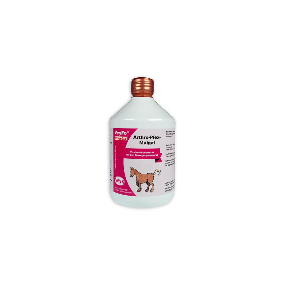 Veyx VeyFo Arthro-Plex-Mulgat: Vitalstoffkonzentrat für den Bewegungsapparat. Pferde haben einen außergewöhnlich großen Bewegungsdrang. Entscheidend für ihre Vitalität und Leistungsfähigkeit ist daher eine gesunde Entwicklung von Knochen und Gelenken. Durch ausreichende Bewegung sowie durch eine artgerechte Fütterung nimmt der Pferdebesitzer hierauf einen ganz wesentlichen Einfluss. Nach wie vor stellen Gelenkfunktionsstörungen ein großes Problem bei Pferden dar.