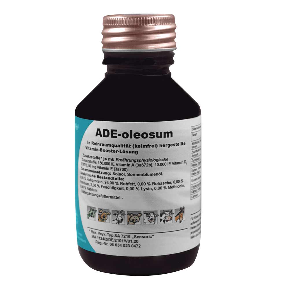 Veyx VeyFo Vit ADE-oleosum ist ein Ergänzungsfuttermittel. Es ist ein in Reinraumqualität (keimfrei) hergestellte Vitamin-Booster-Lösung. Zur bedarfsgerechten Ergänzung der Versorgung insbesondere bei erhöhtem Bedarf vor, während und nach besonderen Leistungs-/Belastungsphasen bei Einzeltieren direkt bzw. bei Tiergruppen über Futter oder Wasser (bei oleosum über Milch)
