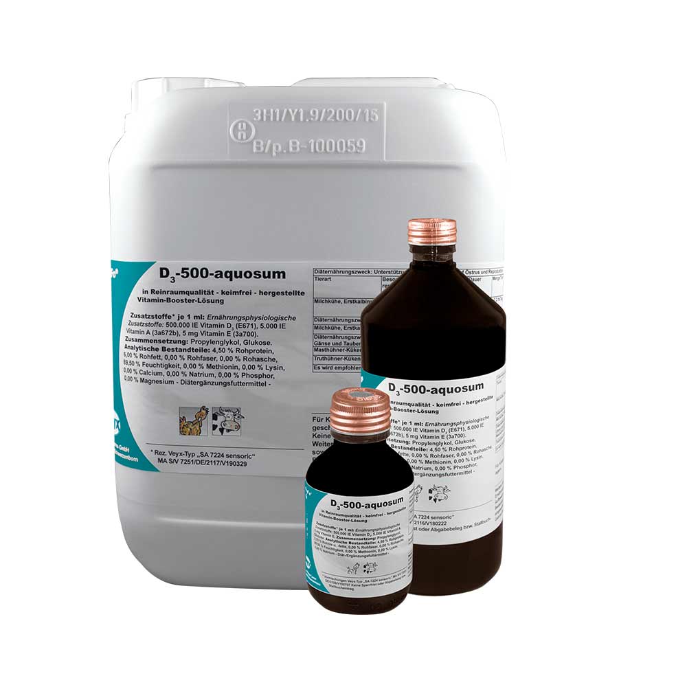 Gänse und Tauben)Tierart Dauer Menge/Tier Verbrauch/Tier Masthühner-Küken nach dem Schlupf pro 2000 Tiere ca. 10 Tage 0.6ml ca. 6ml Truthühner-Küken nach dem Schlupf pro 2000 Tiere ca. 10 Tage 1.0ml ca. 10ml Produktbewertungen für Veyx VeyFo Vit D3-500-aquosum