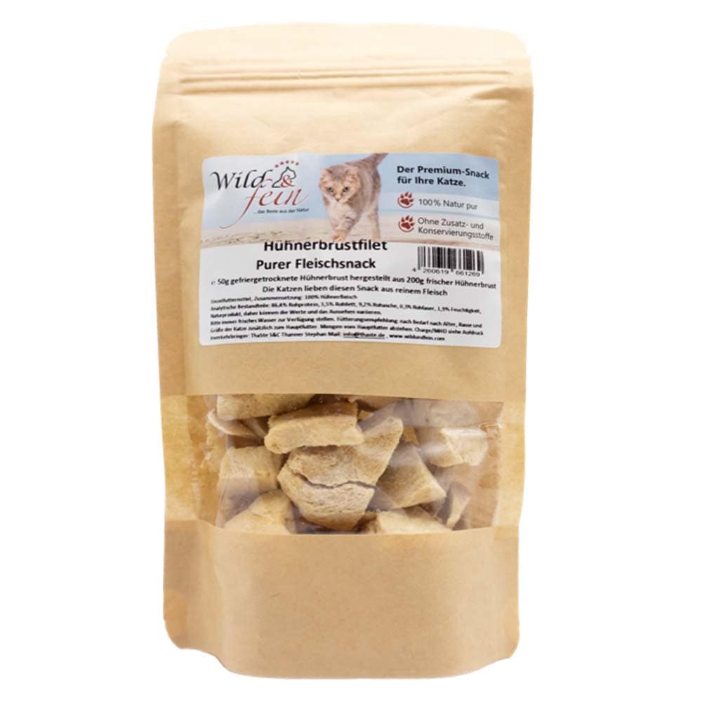 Der Wild und Fein Hühnchenbrustfilet purer Fleischsnack ist ein Produkt aus Deutschland. Der Katzensnack besteht aus 100 Prozent Fleisch und lässt sich auch zum Barfen verwenden.