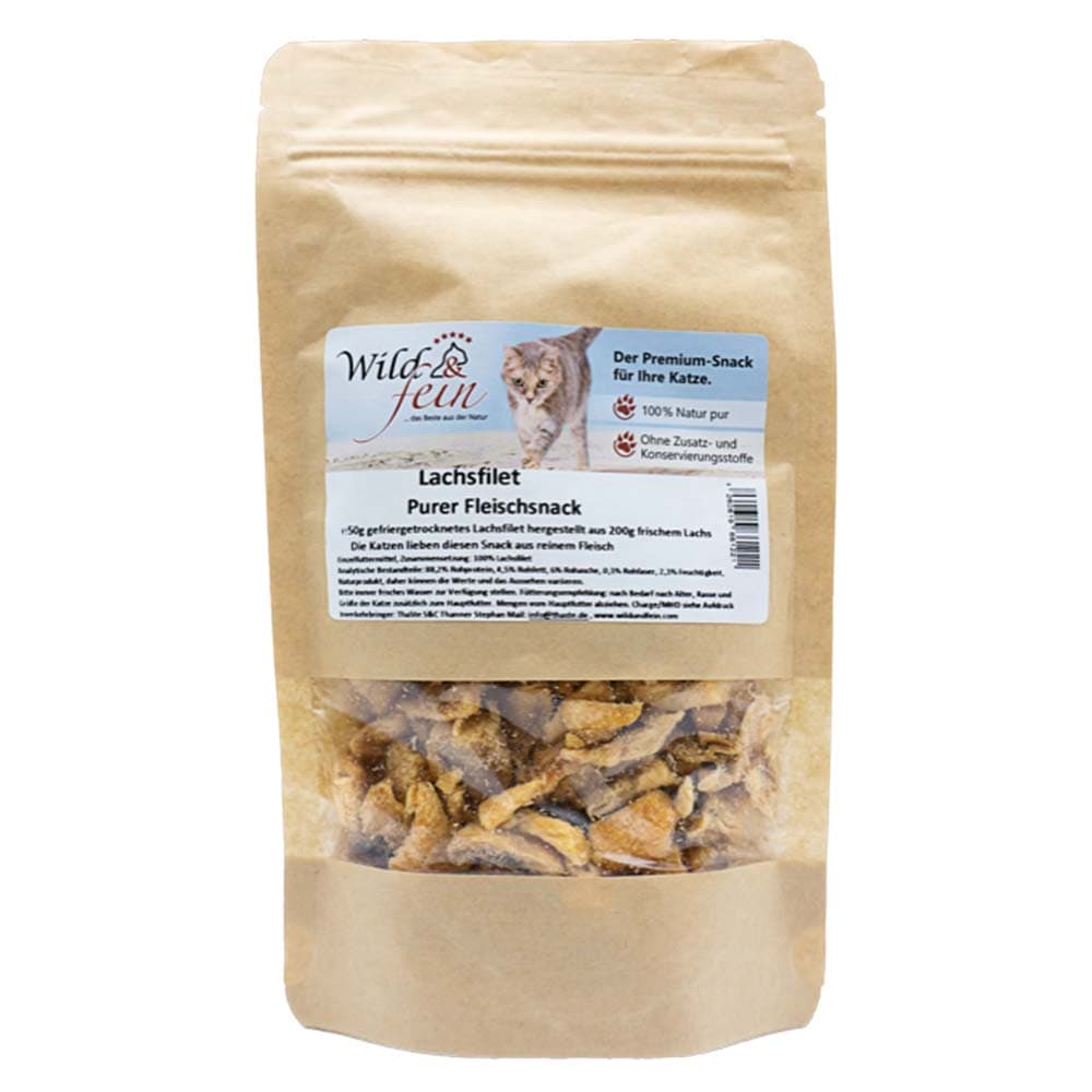 Wild und Fein Lachsfilet purer Fleischsnack für Katzen. Belohnen Sie Ihre Katze mit einem natürlichen Katzensnack mit hoher Qualität. Sie können diesen auch zum Barfen verwenden.